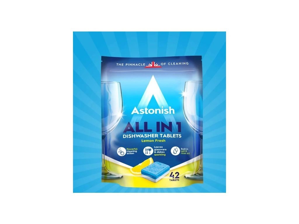 Astonish Tablety do myčky All in One s vůní citrusu 42ks zajistí dokonalou čistotu a lesk vašeho nádobí bez potřeby předmývání. Tyto tablety do myčky kombinují účinné čisticí, odmašťovací a lešticí složky, které bezpečně odstraní i zaschlé zbytky jídla. Díky All in One technologii nádobí nejen čistí, ale také chrání vaši myčku a zanechává příjemnou citrusovou vůni.