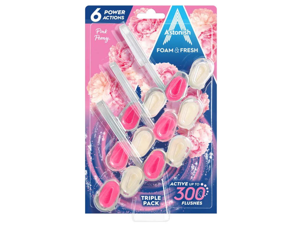 Astonish WC závěsy Pivoňka zajistí vaší toaletě příjemnou a dlouhotrvající vůni květin. Snadno se zavěsí na okraj WC a postupně uvolňují svěží aroma. Balení obsahuje 3 kusy, které udržují toaletu voňavou a čistou. Ideální doplněk pro každodenní osvěžení vaší koupelny.