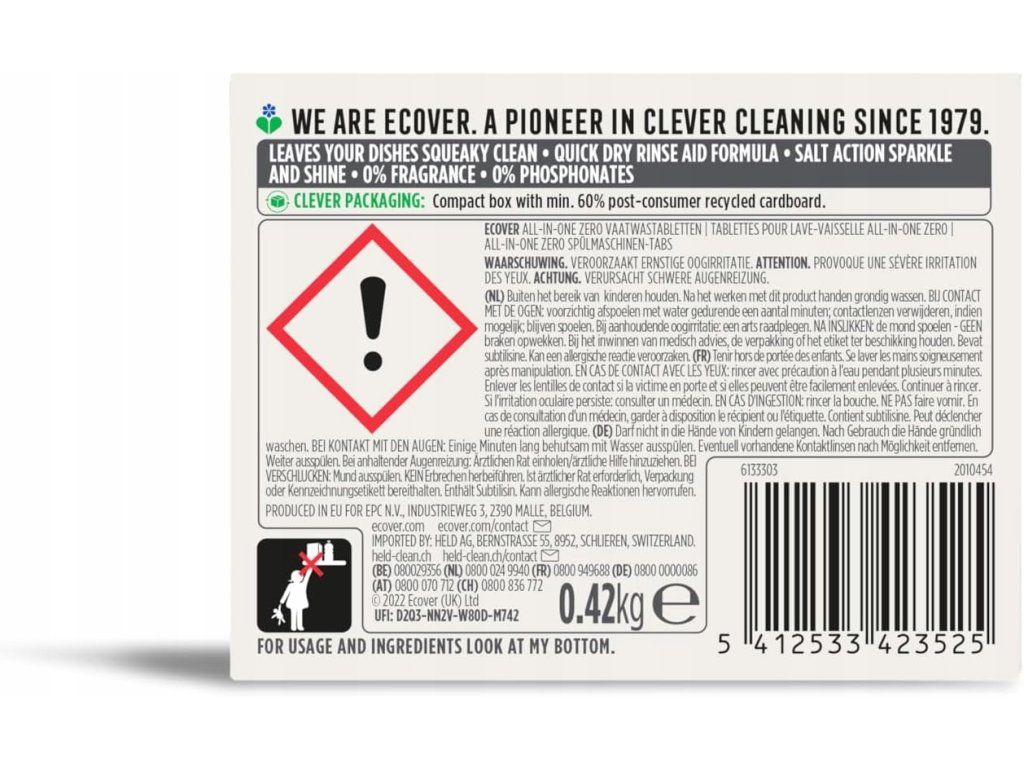 Šetrné, ale maximálně účinné. ECOVER ZERO tablety do myčky bez parfemace zvládnou i odolné nečistoty a přitom jsou vhodné i pro citlivou pokožku. Bez plastového obalu, bez zbytečné chemie – jen čisté nádobí a dobrý pocit. Ideální volba pro každodenní ekologické mytí nádobí.