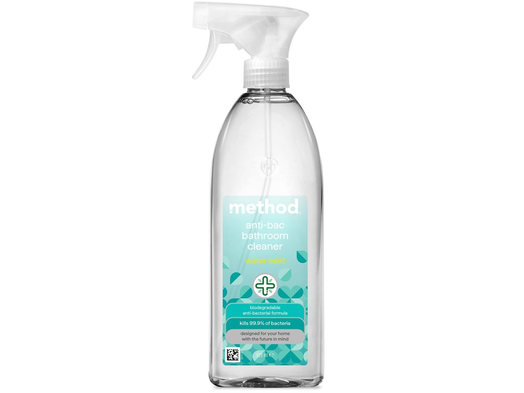 method Anti-Bac čistič na koupelny Water Mint 828 ml zanechává koupelnu hygienicky čistou a svěží. Odstraňuje vodní kámen, mýdlový film a nečistoty, aniž by poškozoval povrchy. Zabíjí 99,9 % bakterií a zanechává příjemnou sladkou mátovou vůni. Ideální pro rychlý a efektivní úklid každodenní hygieny