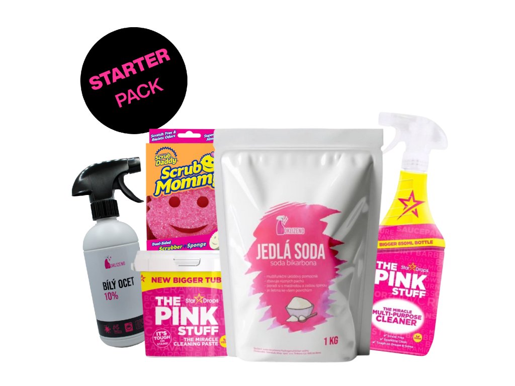 Balíček obsahuje: Biele ocot, Jedlú sódu, The Pink Stuff univerzálnu čistiacu pastu, Univerzálny čistič v spreji a Scrub Mommy.