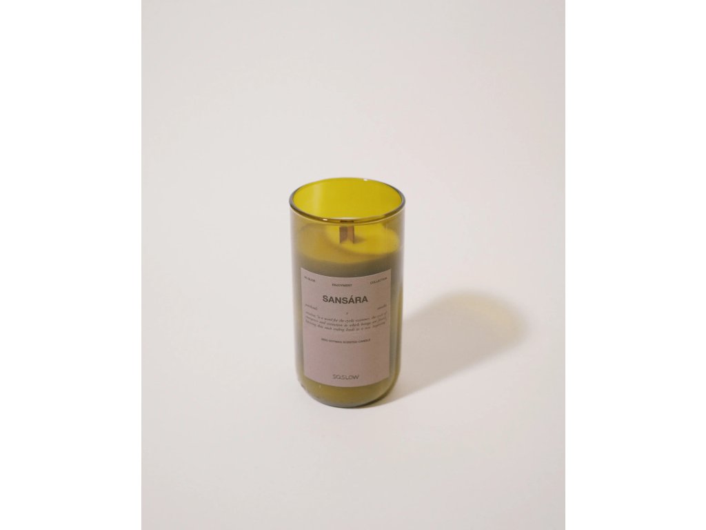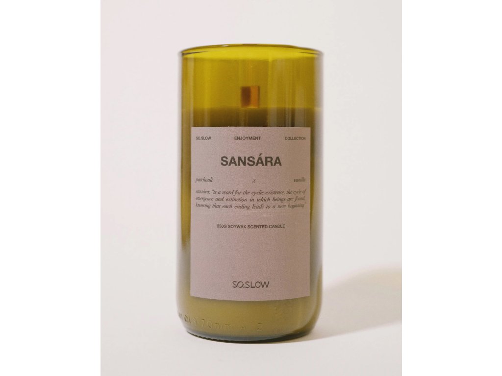 SO.SLOW Sansára - ručne vyrábaná sójová sviečka z Bratislavy s vôňou pačuli a vanilky. Elegantný dizajn v recyklovanom skle z vínnych fliaš a dlhá doba horenia z nej robia perfektný darček aj spoločníka pre chvíle odpočinku.