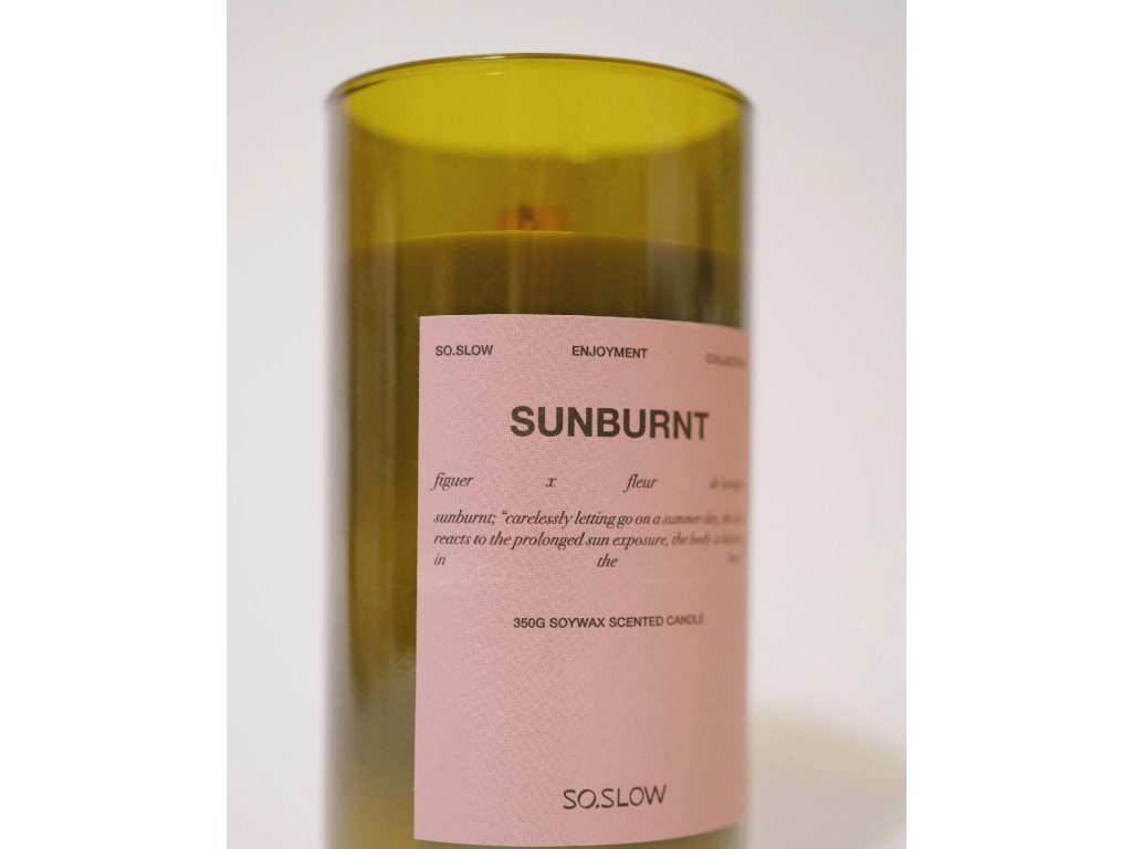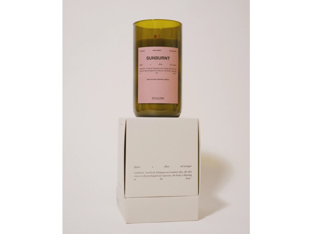 SO.SLOW Sunburnt – sójová sviečka s vôňou figy a pomarančového kvetu z kolekcie Enjoyment je ručne vyrábaná v Bratislave zo 100% prírodného sójového vosku. Elegantná sklenená nádoba vznikla recykláciou vínových fliaš, čím spája ekologický prístup s originálnym designom.