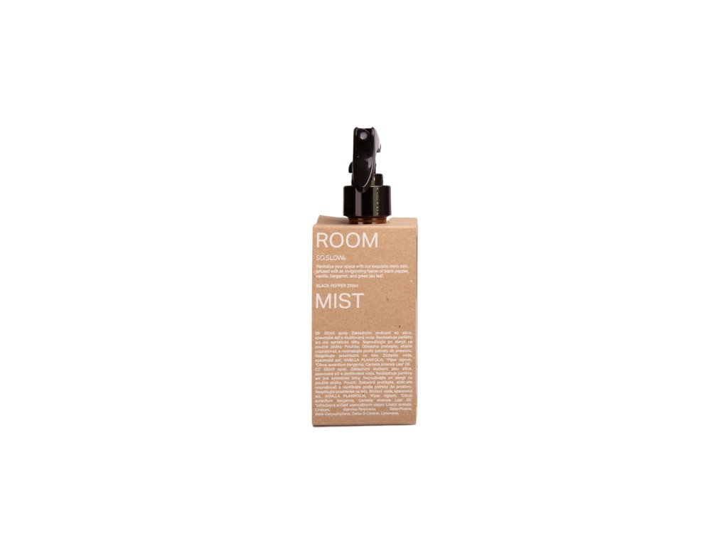 SO.SLOW Room Mist Black Pepper 250 ml spája vôňu čierneho korenia, vanilky, bergamotu a zeleného čaju. Vďaka 100% prírodnému zloženiu a epsomskej soli vytvára harmonickú atmosféru, ktorá vás upokojí a navodí pocit pohody.