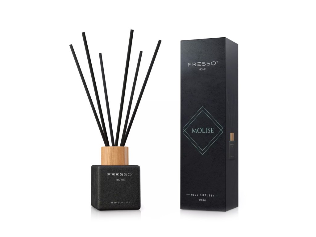 Fresso Home Diffuser Molise je nová štýlová vôňa do domácnosti so životnosťou až 8 týždňov. Fresso Home je nová kolekcia troch mnohostranných vôní do interiéru v podobe nadčasových a veľmi obľúbených tyčinkových difuzérov. Sklenená fľaštička v dizajne kameňa doplnená o drevené ústie spoločne s tyčinkami vás zaujme svojim nadčasovým designom. Následne vás pohltia zmyselné vône FlowScent. Vône poskytujú stabilné generovanie vône bez nutnosti otáčania tyčinkami. Umožňuje plnú difúziu olejov do poslednej kvapky a pritom neobsahuje horľavé alkoholy. Fresso FlowScent poskytujú zvýšenú odolnosť proti zmenám vlhkosti a teploty v miestnosti bez toho, aby spôsobili náhle zmeny intenzity vône. Stačí umiestniť tyčinky do difuzéra a užívať si podmanivú vôňu. Inšpirácia z prírody je tak presunutá do interiéru. Dizajn týchto difuzérov čerpá z autenticity prírody. Celok je potom doplnený čiernymi sklolaminátovými tyčinkami, ktoré dodávajú priestoru jedinečnosť danej vône. Doplňte svoj interiér nadčasovou a jedinečnou formou arómy difuzéra a znovu objavte všetkými zmyslami šik a relaxačnú atmosféru vo svojom domove.